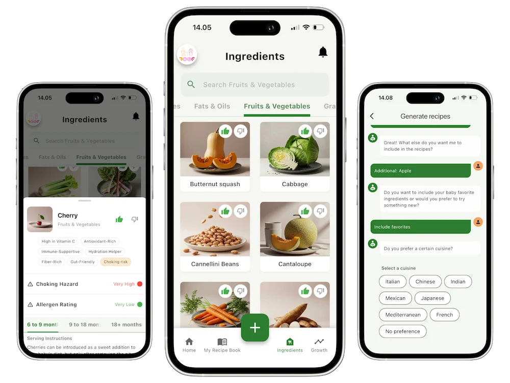 Deja de estresarte por los riesgos de atragantamiento y por qué cocinar. Obtén guías visuales de corte para más de 890 alimentos, deja que nuestro Chef IA planifique tus comidas semanales y escanea etiquetas en busca de alérgenos ocultos. Todo por solo $29.99/año, menos que una sola cena de comida para llevar.