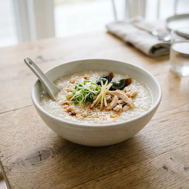 As your baby's appetite grows, you can offer a larger portion of about 1/4 to 1/2 cup (60-120 ml; 2-4 oz). Make the congee a more balanced meal by mixing in a protein source like flaked salmon (for omega-3s), mashed tofu, or finely shredded chicken. To maximize iron absorption from the rice, pair the meal with a food high in vitamin C. For example, serve it alongside soft-cooked bell pepper strips for dipping or some mashed mango. Continue to encourage self-feeding with a spoon, which helps develop fine motor skills and independence during mealtimes.