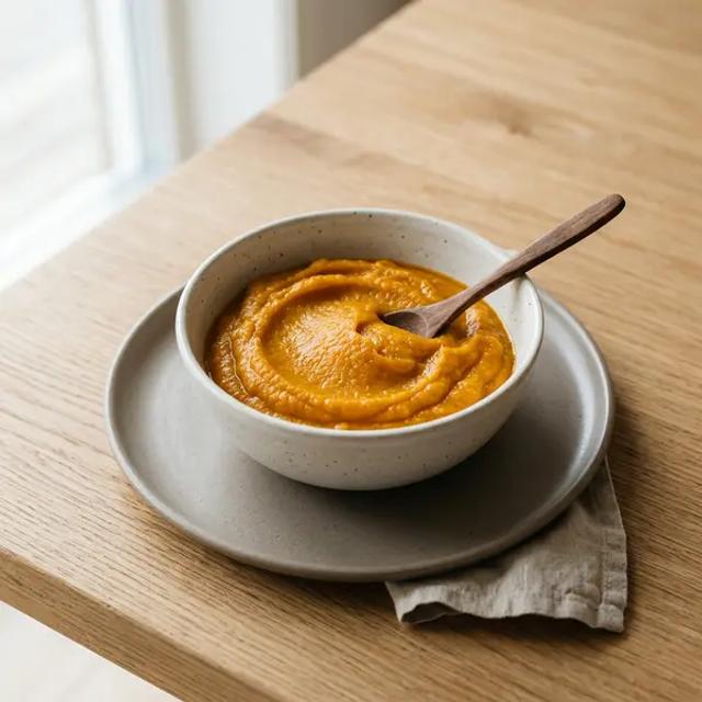 As your baby's appetite grows, you can increase servings to 2-4 tablespoons (30-60 ml; 1-2 oz) per meal. At this stage, encourage self-feeding by using the puree as a dip for soft-cooked vegetable sticks or as a spread on soft toast strips, which helps develop their pincer grasp. For a well-rounded meal, pair it with a protein source like full-fat Greek yogurt, shredded chicken, or scrambled eggs. The vibrant color and nutrients in pumpkin complement many other foods, helping you build balanced and appealing meals for your developing eater.
